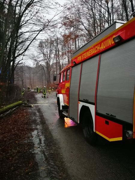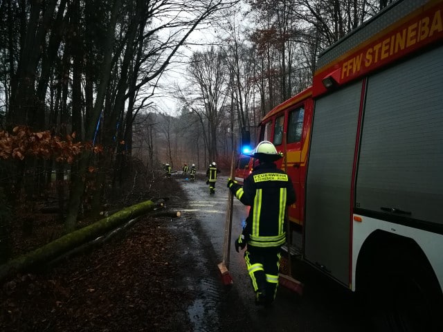 Beseitigen von umgestürzten Bäumen über Fahrbahnen durch die Feuerwehr.