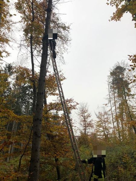 An Baum angeleitert, Feuerwehrmann mit Rettungssatz versuchte die Katze auf zunehmen, diese entscheidet sich aber den Baum auf schnellsten Weg eigenständig zu verlassen.