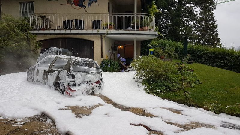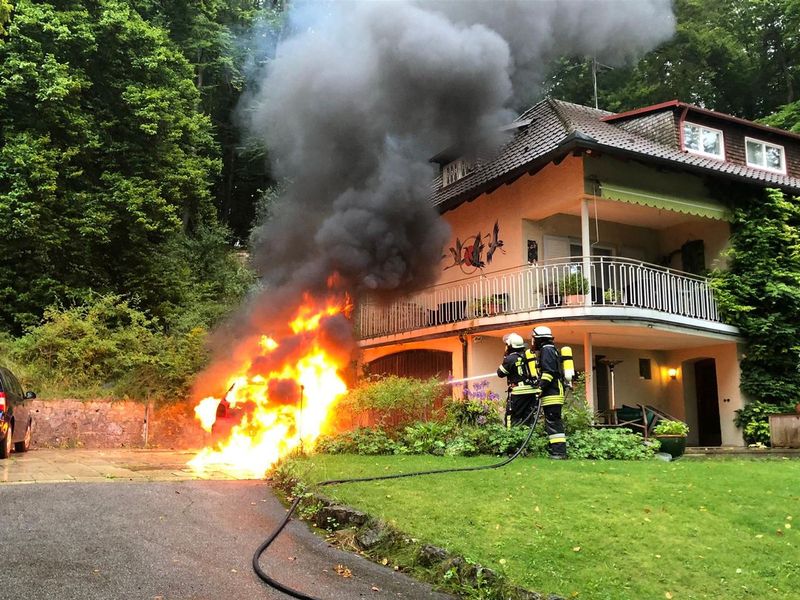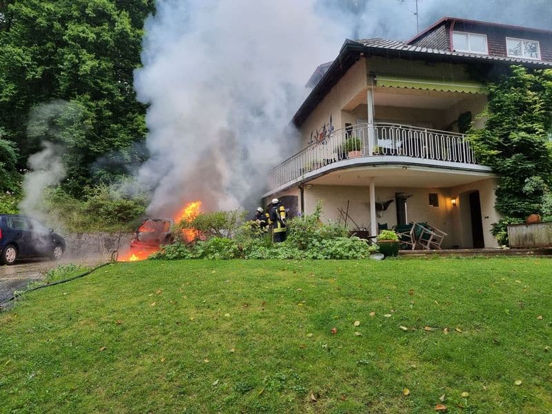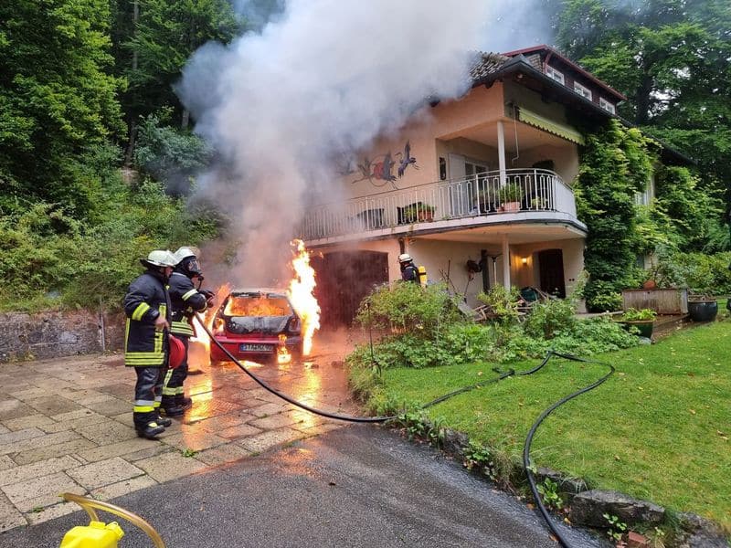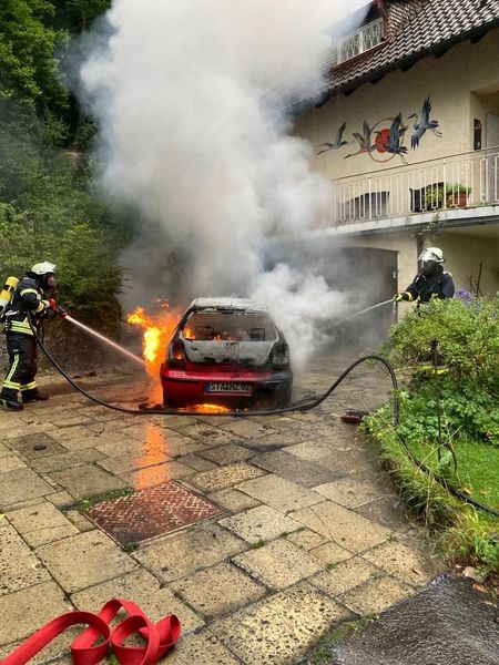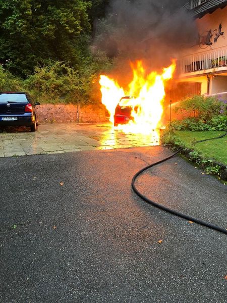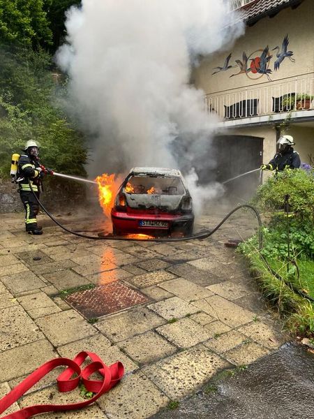 Die Feuerwehr Steinebach-Auing wurde alamiert zu einem PKW im Vollbrand. Durch schnelles eingreifen konnte ein Übergreifen auf das Wohnhaus verhindert werden.