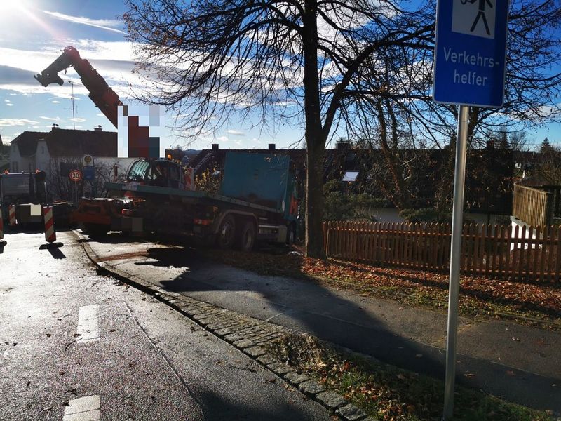 Die Feuerwehr Steinebach-Auing wurde zur Verkehrsabsicherung alarmiert, Vollsperrung Hauptstraße, Ecke Weßlinger Straße nach LKW Unfall.