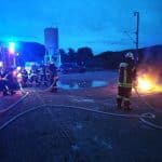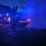 Mutwillig angezündetes Kleinkraftrad, durch die Feuerwehr gelöscht und Einsatzstelle an die Polizei übergeben.