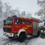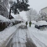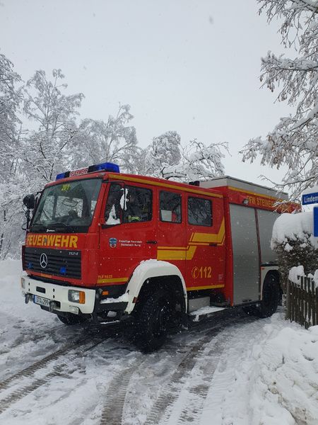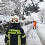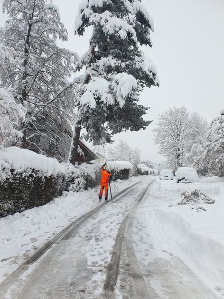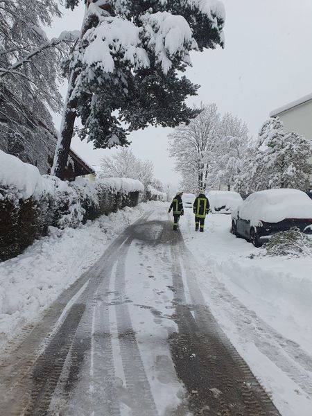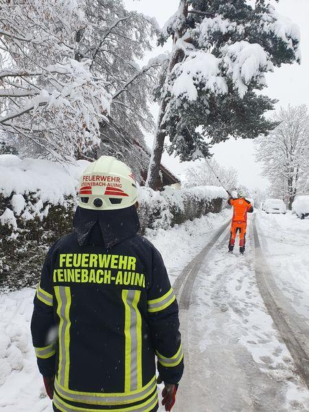 Baum drohte unter Schneelast umzustürzen. Straße geräumt, gesperrt, Autos umgeparkt und durch betroffenen Baum durch Fachmann teilweise abtragen lassen