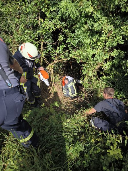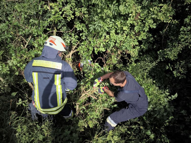 Person mit Rollstuhl steile Böschung herabgestürzt. Person gerettet und anRettungsdienst übergeben .