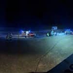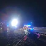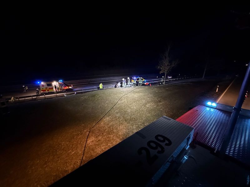 PKW von BAB abgekommen, Schild durchbrochen und zwischen Autobahn und Begleitstraße zum stehen gekommen. Fahrer erstversorgt. Absicherung mit 11/1 und VWA auf BAB sowie mit 20/1 Brandschutz sichergestellt, begleitstraße abgesichert und PKW gegen Kippen gesichert.